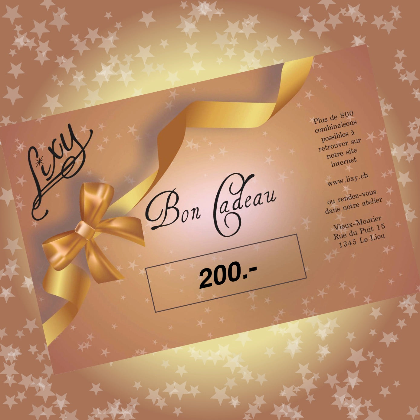Valable sur le site www.lixy.ch ainsi qu'à l'atelier.